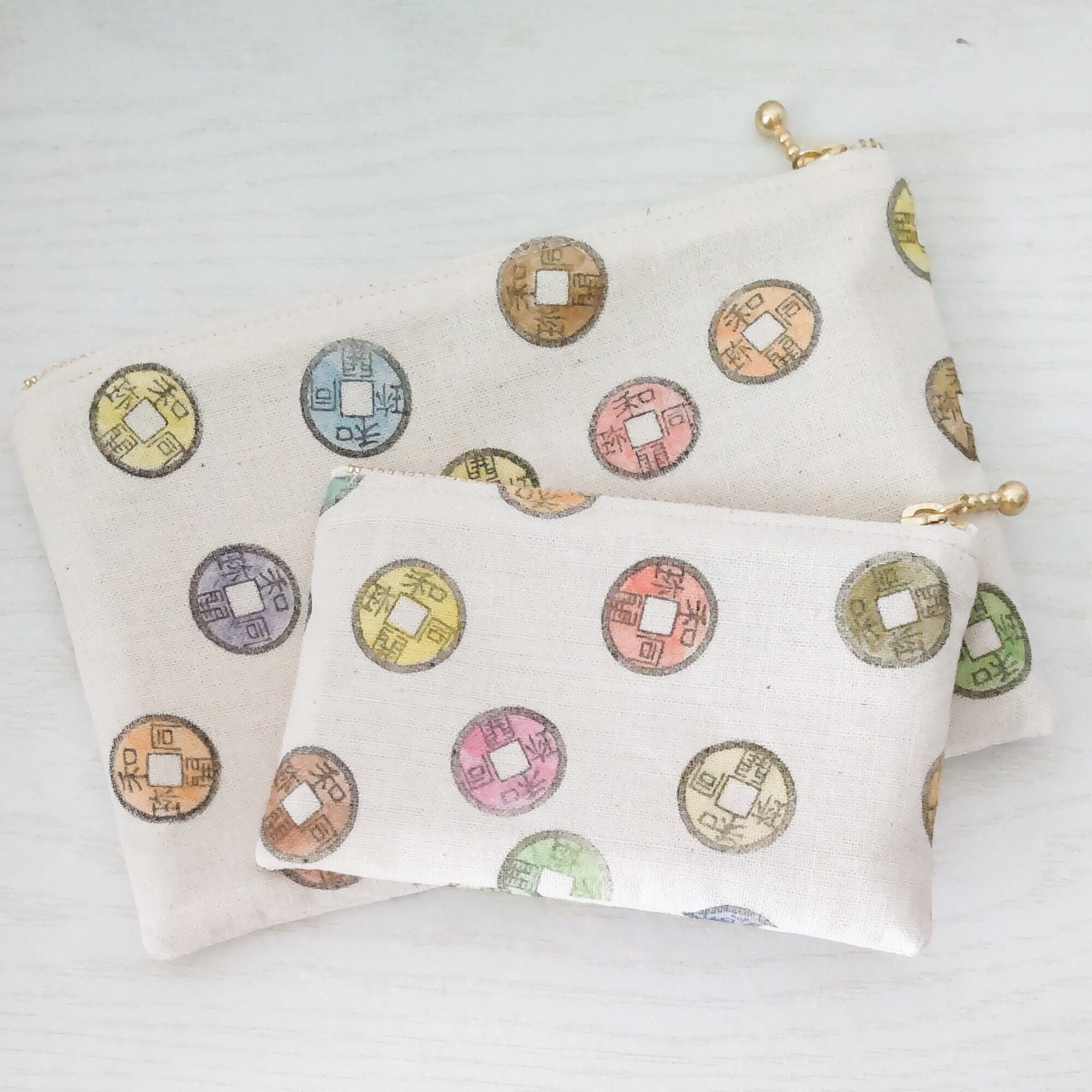 This pouch features a colorful pattern inspired by Wado-Kaichin, one of the earliest coins widely circulated in Japan.