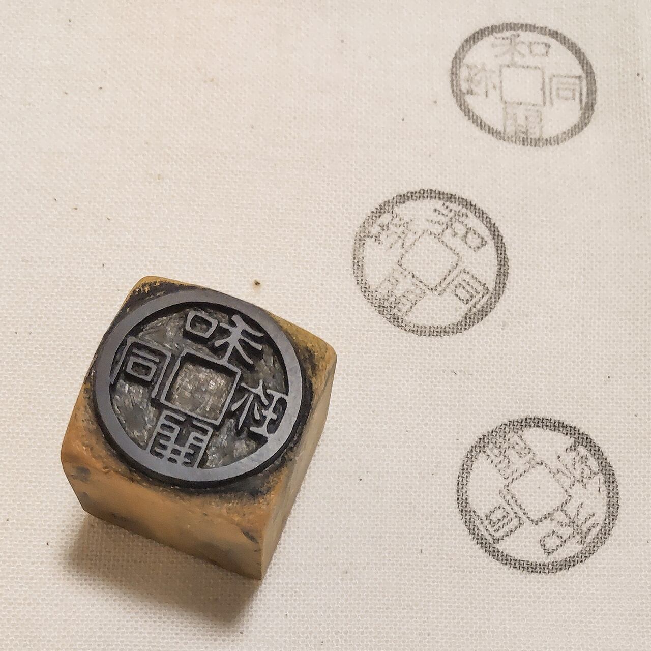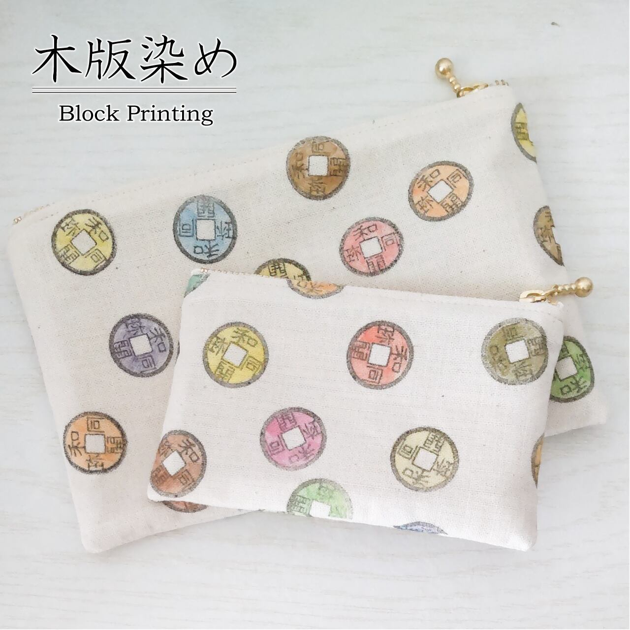 Each pouch is individually printed using a hand-carved wooden stamp, then dyed using a traditional stencil-dyeing process. The slight irregularities in the lines intentionally recreate the natural character of cast ancient coins. With its bright colors and historical motif, this piece combines a playful design with a touch of Japanese history.